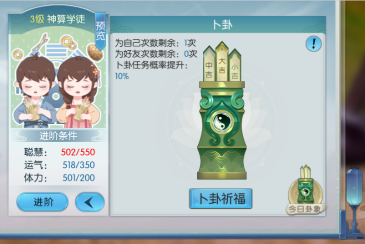 神算萌宝就是个贴心小棉袄,能帮咱们卜卦祈福预测运势。聪慧、运气和体力是它的核心属性,聪慧决定卜卦的准确性,运气影响特殊事件触发概率,体力保证它能持续工作。这类萌宝在精通后还能增加为他人卜卦的次数,所以加点时要优先保证聪慧达标哦。