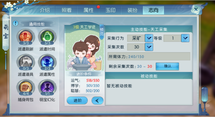 天工方向的萌宝就是个勤劳的小工匠,专门负责采集天工材料和制造。这类萌宝要把运气、博学和聪慧作为重点,运气影响采集效率,博学提升制造能力,聪慧则让它在精通后天工制造时能省下咱们的体力。加点时可以稍微侧重运气,毕竟材料采集是日常最频繁的工作。
