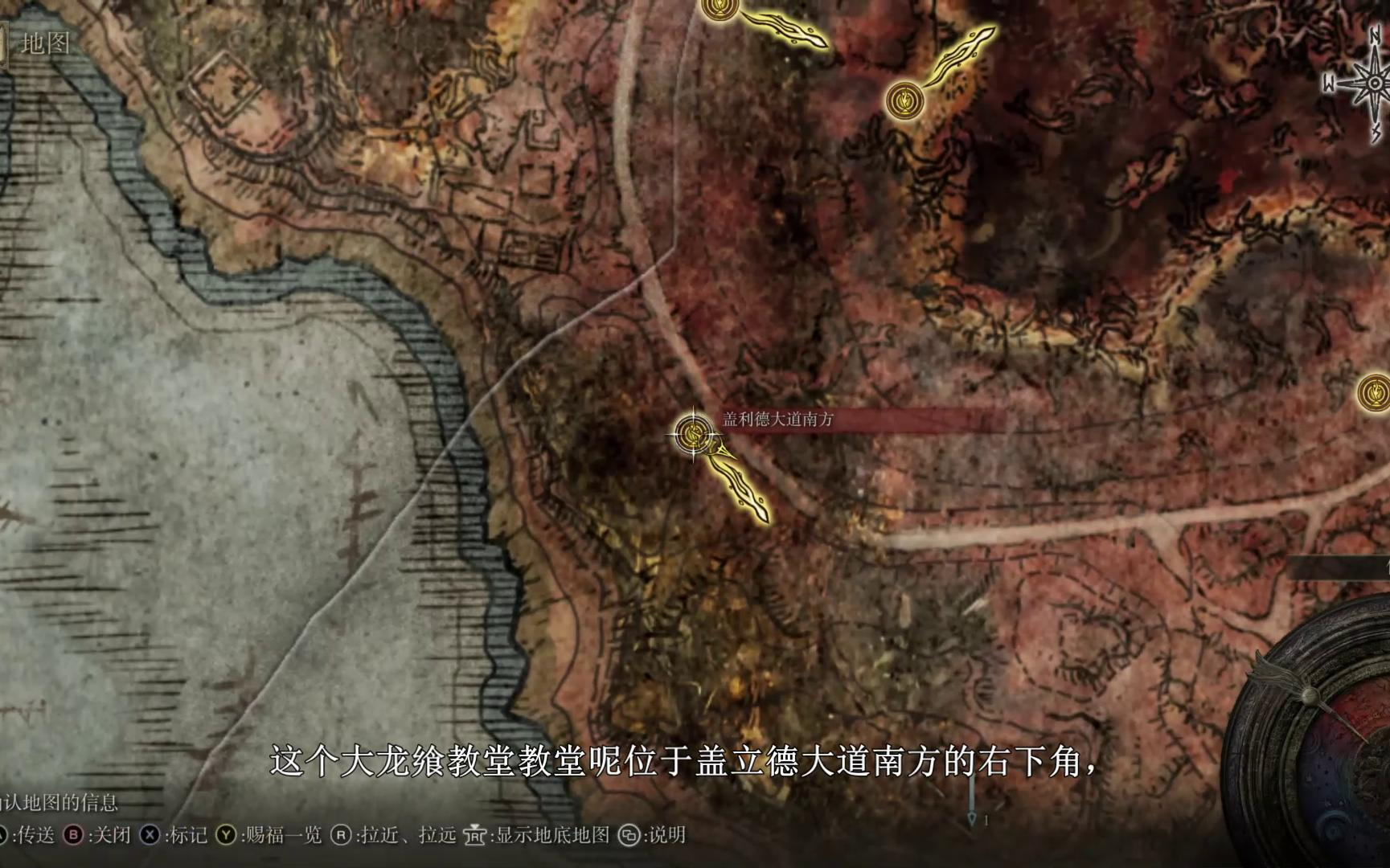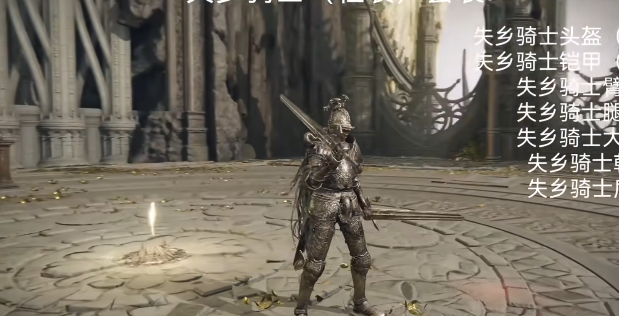 重装套装的部件分布较为分散,其中重装头盔需前往盖利德地区的大龙飨教堂。传送至赐福点后,右侧门口有一名巡逻的剑盾失乡骑士,建议蹲下靠近背刺以提高效率。击败后可获得重装头盔、轻装铠甲、护手、护腿,以及失乡大剑和盾牌。同一区域左侧还有另一名骑士,同样可刷取相同装备。