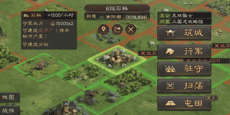 消耗策书对已占领的土地进行屯田,10分钟内可快速获得指定类型资源。该方式适合急需石料升级君王殿或木材建造兵营等场景,但需注意每日策书数量有限,建议优先用于高等级资源地以提升效率。委任内政官可提升资源产量,选择拥有木材采集石料开采加成的武将担任职务,能显著提升每小时产出。
