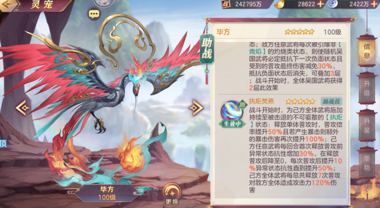 灵宠搭配对火烧队的发挥至关重要,主战灵宠首选毕方,它能大幅提升全队的灼烧伤害,是输出的核心保障。助战灵宠推荐穷奇和烛龙,穷奇可以增强队伍的异常状态抗性,避免被控到死,而烛龙则提供前期的生存能力,帮助队伍平稳过渡到爆发阶段。羚灵的防御和输出加成也是火烧队急需的属性,能让攻击武将在关键时刻打出更高伤害。