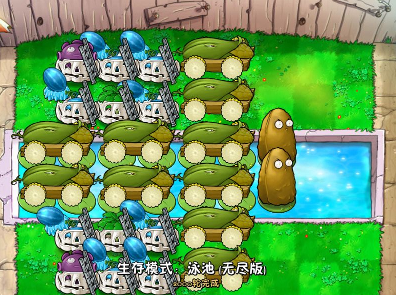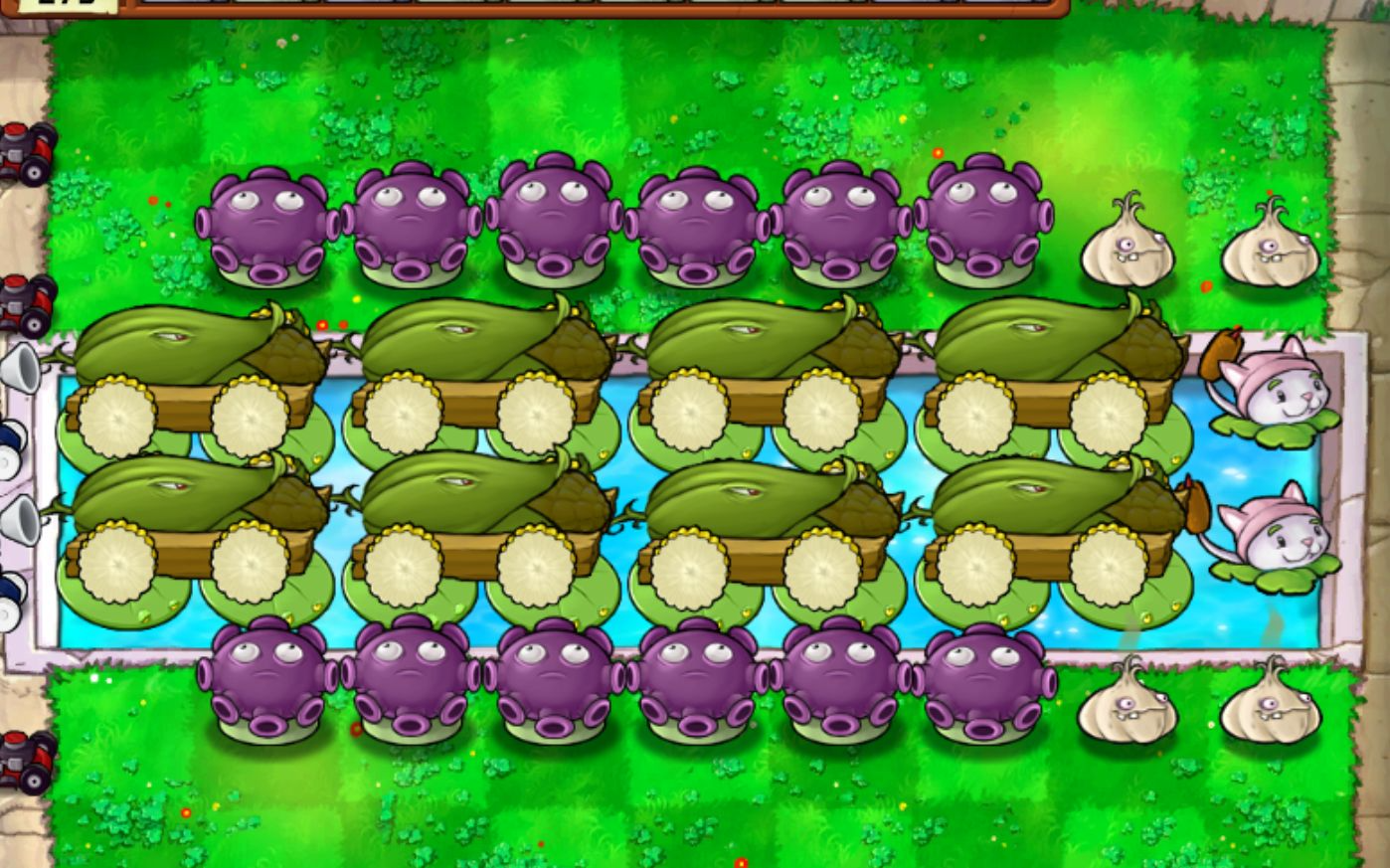 经典八炮阵的具体配置为:第一列陆地种植双子向日葵提供充足阳光,泳池区域布置玉米加农炮;第二列陆地设置忧郁菇和叶子保护伞组合,泳池继续布置玉米加农炮;第三列陆地种植冰瓜,泳池放置香蒲辅助攻击;第七列陆地补充高坚果作为最后防线,泳池区域布置忧郁菇形成交叉火力。这种布局能确保每波僵尸出现时都能被及时清理。