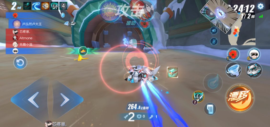 竞速模式的技术要点集中在起步与漂移操作上。超级起步是抢占初期优势的关键,需在倒计时结束时精准触发起步加速。段位漂移(即长漂)适用于直线小弯道,通过方向键与漂移键的配合实现一次性集气与小喷,既能提升过弯效率又能快速积攒氮气。赛道记忆与路线规划同样重要,熟悉每个弯道的角度与道具投放点可大幅减少操作失误。竞速模式更考验个人操作稳定性,需避免因碰撞或路线偏差导致速度损失。