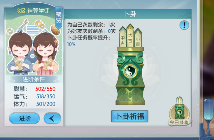 卜卦功能每天只能进行一次,结果会在凌晨4点刷新。如果想让萌宝帮其他玩家祈福,需要组队后点击对方头像选择卜卦交互。精通神算的萌宝不仅能提高特殊事件概率,还能增加每日卜卦次数。自己已经有卦象时无法再接受他人的卜卦,所以最好先找高等级萌宝帮忙祈福。