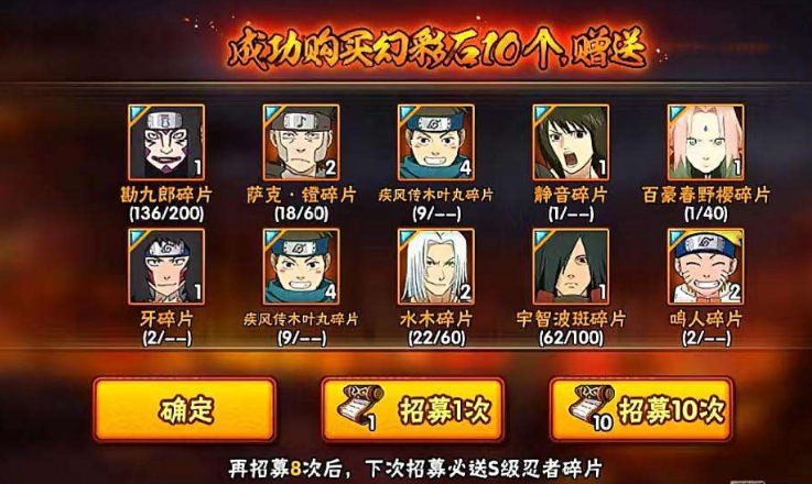 高级招募是获取斑的核心途径之一,每次高招S忍上线时会伴随返利活动。抽满100次必得50片碎片,保底需300次(约3.5万金币)。首付机制(1.68万金币)可先获得30-40片碎片,后续通过免费次数和日常积累补足。建议优先参与高招返利,利用免费抽卡机会降低金币消耗。
