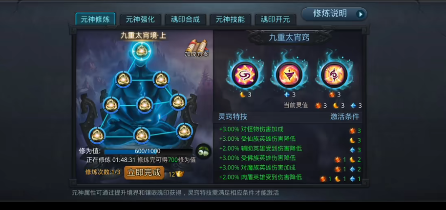 在元神技能的选择上,年兽需优先满足基础条件:英雄等级70级、五星品质、飞升7级。元神技能的伤害和治疗量仅与元神属性相关,与英雄自身面板无关,因此培养时应侧重元神强度的提升。战阵中所有英雄共享元神技能冷却时间,因此需避免重复释放造成的资源浪费。建议将年兽设置为战阵中唯一携带元神技能的英雄,以最大化其控场和输出价值。