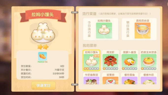 制作拉姆小馒头需要前往淘淘乐街的美食城,进入自己的餐厅进行操作。餐厅位于地图上明确标注的位置,通过自动寻路功能可轻松抵达。进入餐厅后需先完成基础布局,随后前往厨房区域找到烹饪台,点击右侧出现的交互按钮即可打开食谱界面。在食谱列表中选择拉姆小馒头并点击快速烹饪选项,系统将自动消耗摩尔豆开始制作流程。