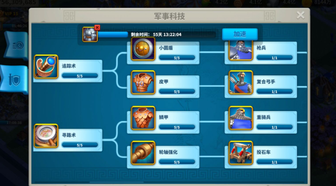 科技研究是提升战力的核心途径之一。优先在学院里点满军事科技,尤其是T4兵种相关的研究,能直接增强部队战斗力。经济科技可以稍后补,因为前期通过探索村庄就能获得部分经济科技加成。军事科技中的防御阵型、兵种克制等研究能让你在战斗中占据优势。记得合理分配加速道具,优先用在关键科技上,避免资源浪费。