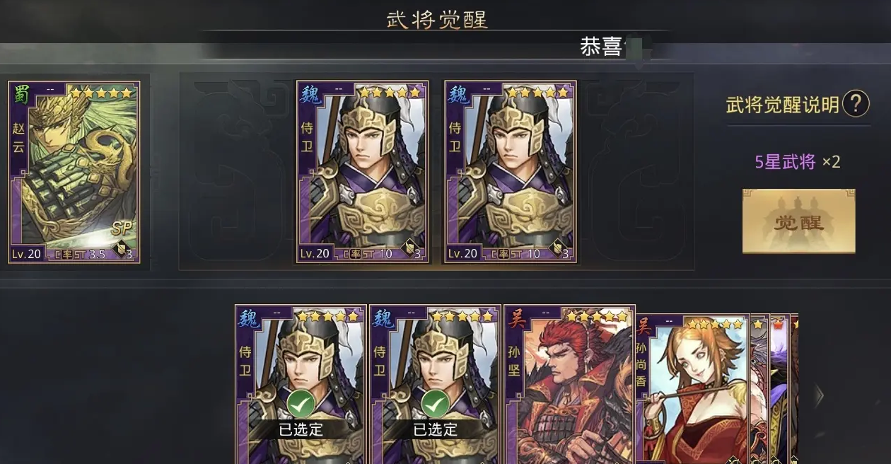 侍卫卡使用起来很简单,当你想要觉醒某个五星武将时,在觉醒界面选择侍卫卡作为材料就行。不过侍卫卡只能用于觉醒,不能上阵战斗,所以千万别想着培养它。侍卫卡一般通过签到或者活动获得,平时记得多留意游戏内的各种福利活动,说不定就能拿到几张。