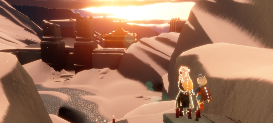 进入滑行赛道后,你会开始一段高速下滑的旅程。这段路不需要特别操作,只要跟着白鸟的指引前进就不会迷路。赛道中间有几个光之翼,如果想收集可以稍微调整方向,但要注意速度,否则容易错过。滑到后半段会经过一个亭子,里面有一个先祖,可以顺手点亮。继续滑行到底部,就会到达环形竞技场,这里就是滑雪场的终点。