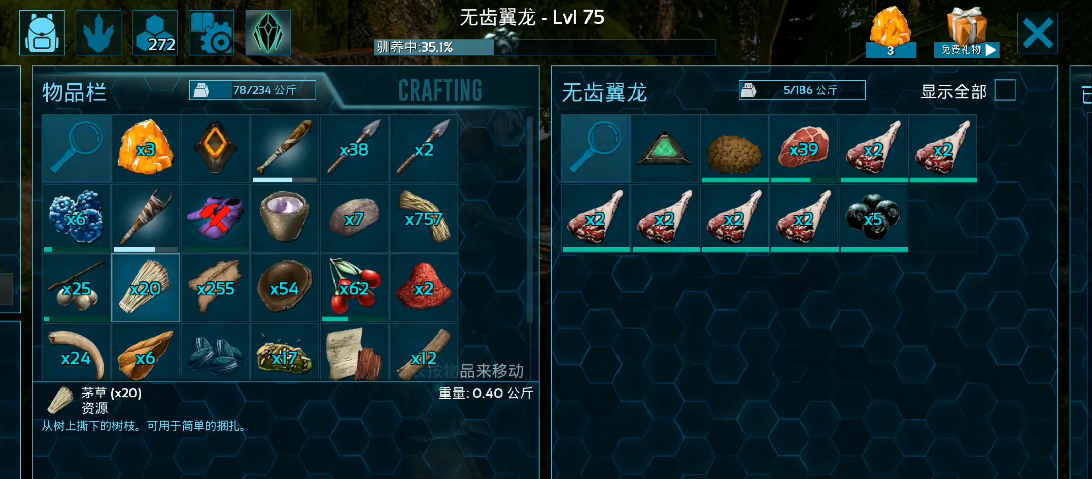 驯服后的翼龙需通过鞍具激活骑乘功能。鞍具制作需达到38级并消耗兽皮、纤维等基础材料,建议优先提升角色等级。骑乘时按空格键起飞,左Shift加速,但其负重和耐力属性较低,不适合长途运输。翼龙的机动性在探索地形或躲避陆地威胁时极具优势,尤其在采集悬崖资源或跨越水域时效果显著。