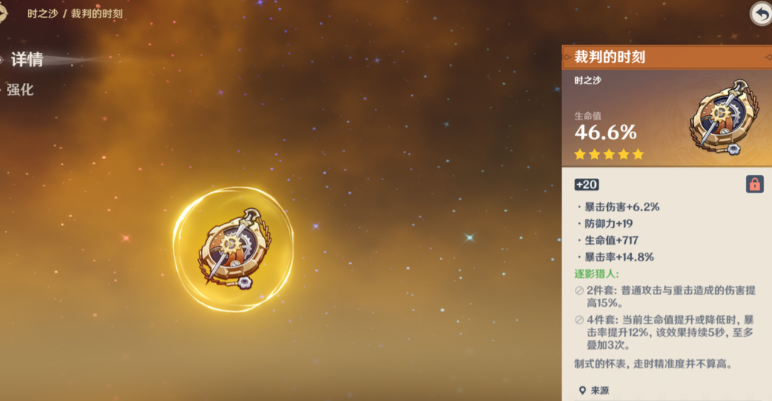 她是个靠生命值转化攻击力的火系主C,同时依赖蒸发反应打输出,所以元素精通和生命值对她都很重要。时之沙的主属性选择直接影响这两项属性,而副词条的暴击、暴伤、生命百分比也会影响最终伤害。如果副词条已经堆了不少精通,可以考虑生命沙来平衡属性;反之如果缺精通,沙漏补足会更划算。