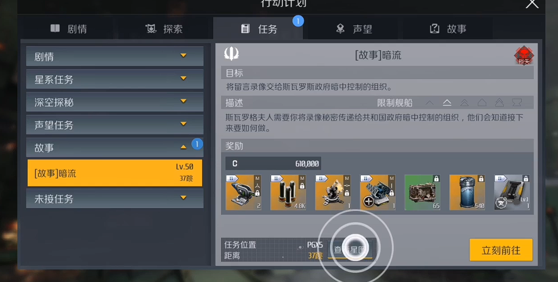 暗流任务是第二银河中一个比较特别的支线剧情,想要接到这个任务,首先需要提升晨曦共和国的声望等级。当你的声望达到4级后,就能在凌冬工业的空间站找到任务接取点。具体位置在太空站的Headquarters区域,点击后就能看到任务提示。这个任务会带你探索一段关于星际阴谋的故事,过程中需要解锁多个星系,建议提前准备好跃迁燃料和战斗装备。