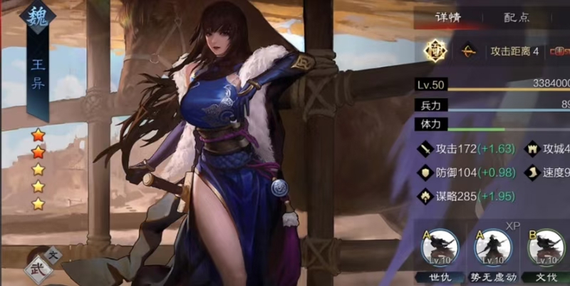 王异也是一个非常适合携带先驱突击的武将,她的自带追击战法发动率很高,配合先驱突击的连击,能在前三回合内打出爆炸性的谋略伤害,这种组合在法刀队中非常流行,能快速解决战斗,避免拖入持久战消耗过多资源。王异的谋略属性不错,搭配先驱突击后,不仅输出可观,还能在一定程度上无视敌方的规避效果,实用性很强。