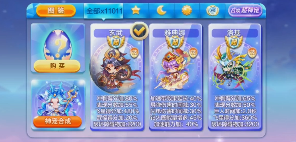 玄武的技能主要围绕着提升生存能力和在特殊模式里的表现,把它设为出战宠物后,在特定关卡能发挥不错的作用。维纳斯的技能属性则非常突出,它的加速能力和钻火圈能量增多的比例都非常高,这对需要频繁冲刺和积累能量的跑法来说是个巨大的助力。至于雅典娜,她的技能设计在多人对战中显得尤为出色,不仅能提高超级冲刺的速度上限,让每次超级冲刺都飞得更远,还拥有周期性小幅提速冲锋的能力,这让无论是冲刺型还是冲锋型坐骑搭配她都能获得可观的加成,整体表现非常稳定。