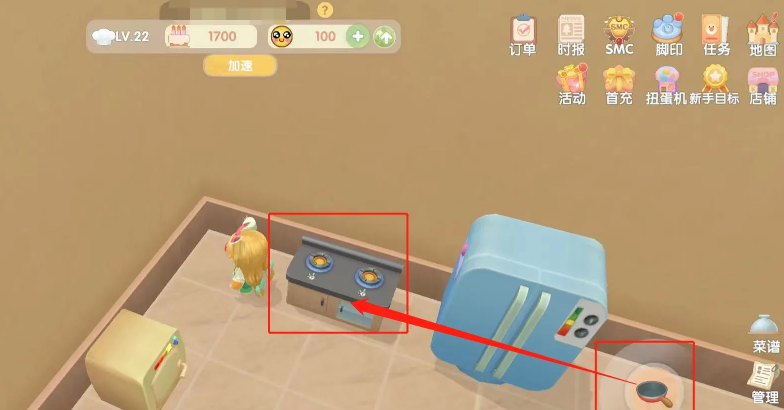 使用炒锅开火,首先需要进入自己的餐厅场景,在餐厅中找到灶台并靠近它,这时屏幕右侧会显示一个平底锅形状的图标,点击该图标后便会进入菜谱选择界面,在这里可以浏览并选择想要制作的菜品,选好菜谱后就可以准备进入点火环节了。