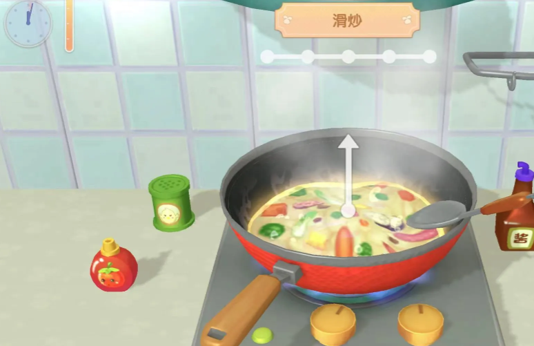 点火失败时无需气馁,多试几次就能发现操作逐渐变得得心应手,关键在于保持耐心并专注于指针与橙色区域的重合时机。一旦点火成功出现蓝色火焰,便会自动进入翻炒或搅拌的后续阶段,这时需要根据屏幕提示完成相应的手势操作。整个过程中火候的稳定控制对菜品最终成果有直接影响,因此每一步都需认真对待。