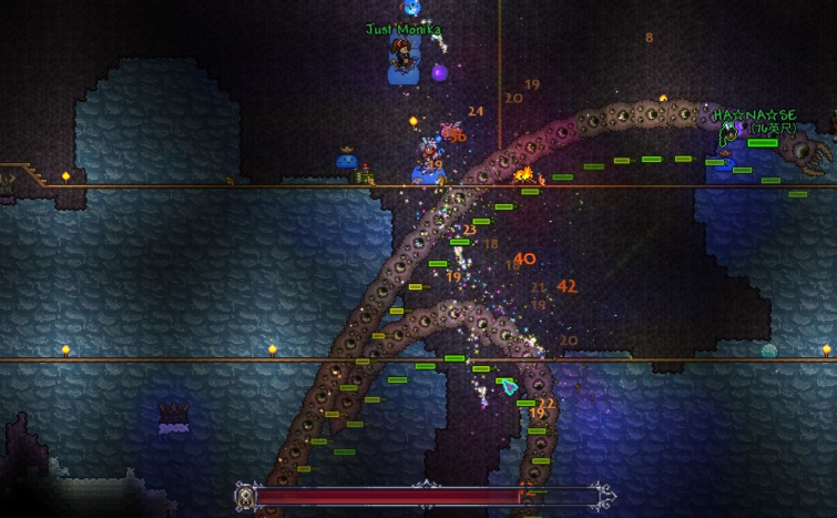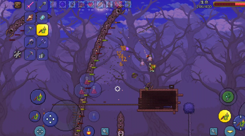战斗过程中,要优先攻击世界吞噬者的头部,因为头部比较脆弱容易快速击破。使用穿透武器如魔刺或弓箭,能有效对付分裂后的更小蠕虫。在移动中保持距离,利用钩爪固定位置,防止被蠕虫包围。时刻注意躲避它的冲撞和毒液攻击,利用场地的高低差跳跃来规避伤害。世界吞噬者的身体节段被击破时会分裂成更小的个体,这增加了战斗的复杂性,所以要有耐心。战斗中它会不断移动和钻地,建议保持横向跑动,用快速武器连续输出,避免停顿。如果生命值低,及时使用掉落的治疗星星或药水补充。