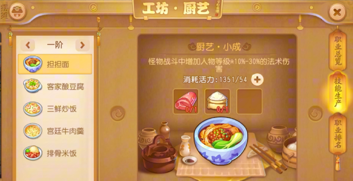 工坊职业分为采集和生产两大类,采集类包括采矿、耕种、渔猎和采集四种技能,生产类则包含厨艺、药术、乐艺、石艺和考古五种技能。采矿技能需要铜矿、铁矿等矿石材料,耕种技能依赖小麦、水稻等农作物,渔猎技能涉及鲤鱼、草鱼等鱼类资源,而采集技能则覆盖其他基础物资。生产类技能中,厨艺可制作提供临时属性加成的食物,药术能炼制用于PVE和PVP的药品,乐艺、石艺专注于制作功能性或装饰性物品,考古则通过挖宝直接获取经验与银币。考古作为特殊生产技能,不需依赖采集材料,但升级时可能需跨技能协作,例如考古升级需糖醋鲤鱼,这就要求玩家配合学习厨艺或渔猎技能。