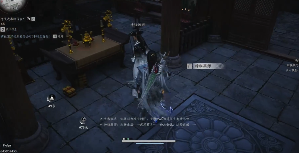 进入武库后,玩家将面对守护者石贞等敌人并进行战斗,在武库深处需击败这些守护者以获取神秘的兵书,战斗时应注意敌人的攻击模式,利用闪避和反击策略,同时关注自身生命值管理,击败敌人后可从武库后的梯子爬上去,找到密道钥匙和登记处钥匙,从而解锁先前无法访问的区域和宝箱。完成任务核心部分后,玩家需通过密道返回并将兵书交付给神秘画师,交付地点通常在镜潭的亭子处,画师的对话会揭示更多剧情背景,之后可能涉及跟踪封三刀等npc以探索额外秘密,整个过程结束后,玩家可获得丰厚奖励如装备和经验值,并深入游戏故事线。
