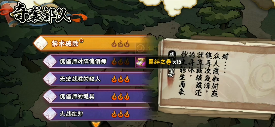 开启奇袭部队的关键步骤是进入游戏的冒险模式。在主界面的右下角,可以看到一个标有冒险字样的卷轴图标,点击它就能开启冒险模式的界面。玩家会看到多个副本选项,其中包括了羁绊的开始和波之国等,而第四次忍界大战副本正是包含奇袭部队的环节。进入冒险模式后,副本通常分为试炼、修罗等不同难度,需要逐步挑战来解锁后续内容。