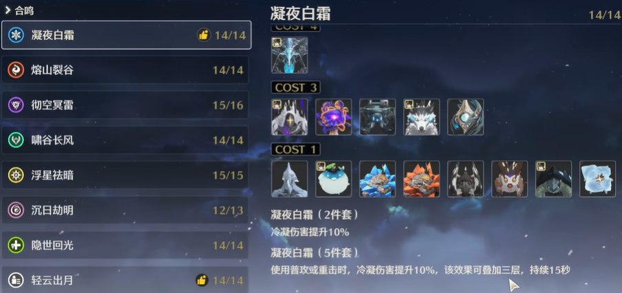 声骸套装及其主副词条是塑造面板的关键环节。后期成型的散华首选声骸套装为凝夜白霜五件套,其效果能在使用普攻或重击后提升冷凝伤害。在套装选择上,也有采用轻云出月2件套搭配凝夜白霜2件套的组合,以换取更灵活的声骸搭配与更快的技能循环速度。在声骸词条方面,主词条优先级为:Cost4部位选择暴击率或暴击伤害,Cost3部位选择冷凝伤害加成,Cost1部位选择攻击力百分比。副词条则优先追求暴击、暴击伤害、攻击力百分比以及上述的几种伤害加成。如果选择以辅助为核心的轻云出月4件套玩法,则需要将共鸣效率堆叠至130%左右,以满足套装效果触发条件,此时面板的伤害属性会相应有所降低。