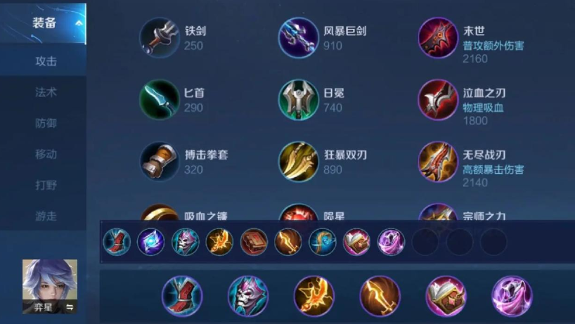 AD流派弈星的核心出装思路围绕攻速、暴击与物理攻击展开。通常以急速战靴作为起点,以解决前期攻速需求并为走A提供支持。核心输出装备通常选择闪电匕首与无尽战刃,闪电匕首能进一步提升攻速与暴击率,其被动的电弧效果可与弈星的攻击机制配合;无尽战刃则大幅提升暴击伤害,是强化普攻爆发力的关键。为了保证续航能力,噬神之书是必备装备,因为弈星的普攻为法术伤害,法术吸血可以高效地转化为生命回复。后续装备可根据战局选择,虚无法杖能提供法术穿透以应对高法抗对手,而破军或宗师之力则能进一步放大物理攻击的收益。最后一件装备可根据生存压力选择保命装。