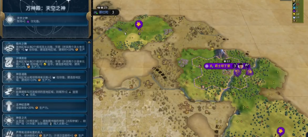 开局的地理环境是选择万神殿时必须尊重的客观条件。如果你的首都周围拥有大量特定地貌或资源,那么与之对应的专属信条往往能带来极高的前期收益。在沼泽或泛滥平原较多的区域,芦苇沼泽女神提供的生产力虽然单次增益不高,但在早期多个城市累积起来也能有效加速建造进度。而在牧场资源丰富的开局,天空之神的价值会变得非常突出。反之,如果你的地形缺乏特色,那么宗教移民这种直接赠送一个开拓者的泛用性信条,或是能稳定提供文化、信仰的通用信条,则是更为稳妥可靠的选择。