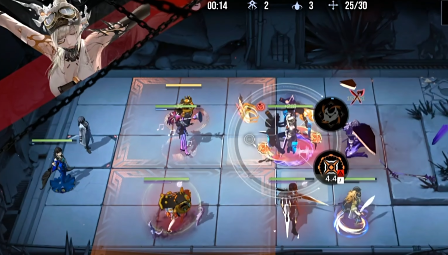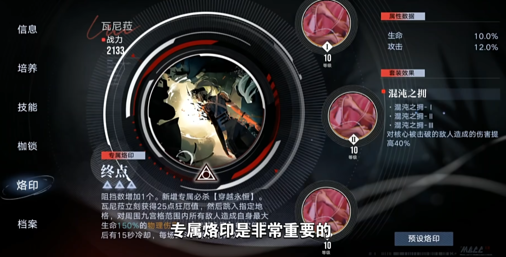 瓦尼菈的技能机制独特且与她的生命值属性深度绑定,其核心在于势能蓄积与动能释放两个可切换的必杀技以及被动触发的额外伤害。普通攻击外骨骼手臂是交替使用双拳进行的物理攻击。必杀技势能蓄积使瓦尼菈进入蓄力状态,在持续时间内每秒回复一定比例的最大生命值,同时该必杀技会切换为动能释放;动能释放则是对前方九宫格范围内的所有敌人造成基于自身最大生命值比例的物理伤害,并附带核心伤害,使用后技能切回势能蓄积。若在势能蓄积持续期间未使用动能释放,结束后会回复能量。被动技能啮合效应使得瓦尼菈每造成数次普攻伤害后,下一次普攻会触发啮合,对前方九宫格造成基于生命值比例的额外范围伤害并获得狂厄值;另一被动单向传动会提升啮合的伤害,当啮合仅命中一个敌人时伤害会进一步增加。她的专属烙印提供了额外技能穿越永恒,这是一个冷却时间较长且每场战斗限用两次的位移技能,可以跳向指定地格并对周围造成范围伤害。