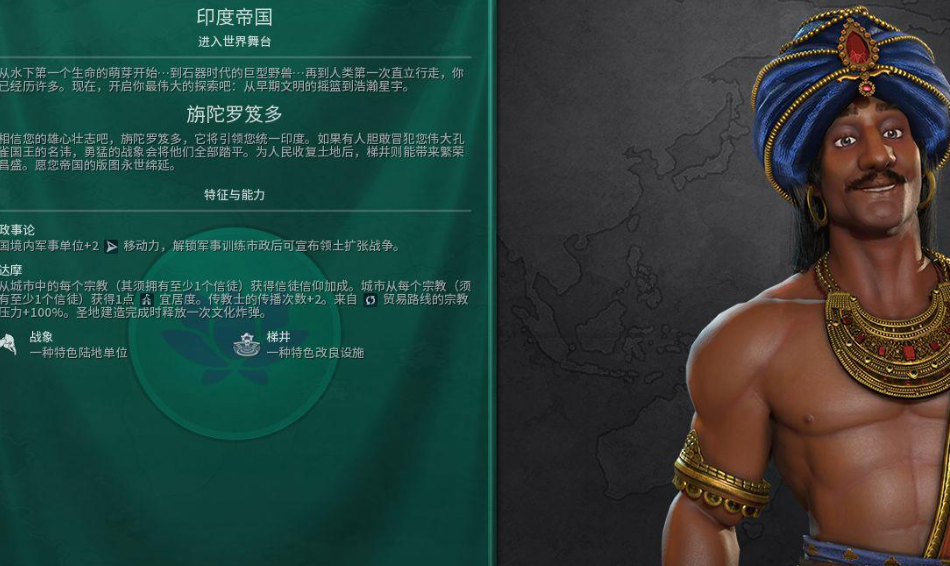 宗教胜利是印度最稳定高效的路线,其文明特性与宗教机制高度契合,能够快速积累信仰值并压制对手的宗教传播。领袖甘地的非暴力不合作特性为每名创立宗教的和平文明提供额外信仰,配合阶梯井改良设施的早期信仰与粮食产出,可在古典时期就建立信仰优势。战象单位虽移动力受限,但能有效清除邻近宗教文明的军事威胁,为宗教扩张扫清障碍。