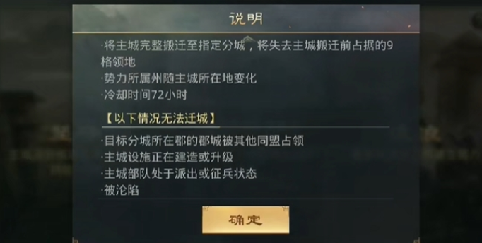 系统对迁城存在多重限制条件,包括72小时内仅能操作1次、名声需达到5000点、需攻占相邻11块无建筑领地等。被俘虏状态下无法执行迁城,且目标分城所在郡的郡城若被其他同盟占领也会导致操作失败。这些设定要求玩家必须结合当前局势审慎决策,避免因条件不符浪费战略资源或错失战机。
