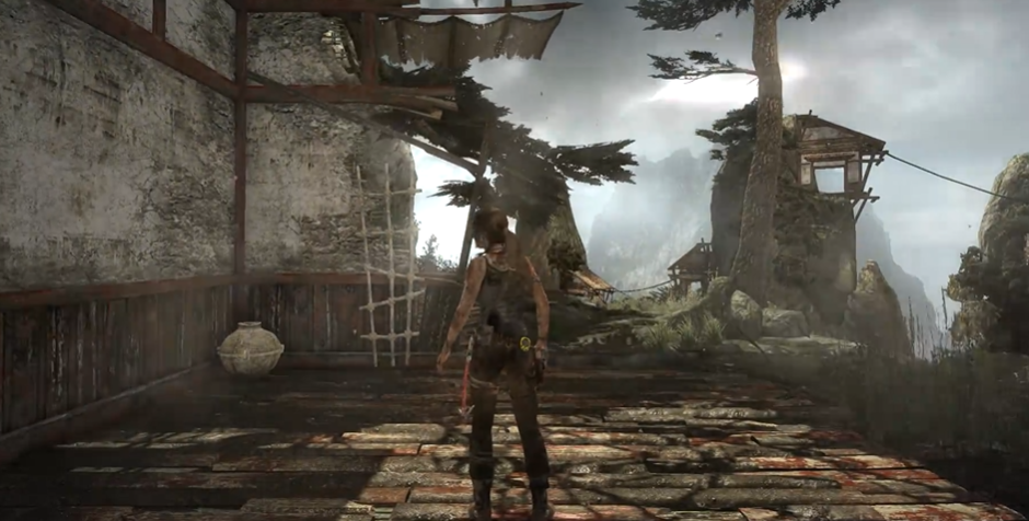 玩家需要操控劳拉穿越一系列危险地形并解决战斗与解谜。关卡开始时,利用空中的布幡跳跃至对面屋子,随后房屋会陆续坍塌,需快速奔跑并跳跃至安全区域。抵达木屋后,会目睹飞行员被盾牌兵刺杀,需击杀盾牌兵并沿栈桥前进至营地峭壁远景。在此过程中,需注意地形变化,避免因延迟操作导致坠落。