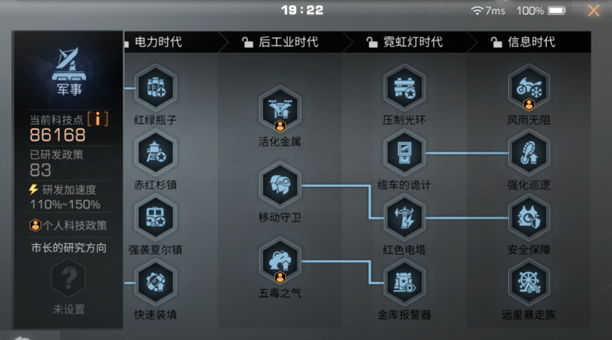 科技配置需根据营地发展阶段和个人需求灵活调整。营地时代等级越高,可配置技能数量越多,最高可拥有5个自然科技+5个任意科技+5个个人科技的组合。配置时需注意营地科技次日凌晨3点生效,个人科技不消耗资源但营地科技会消耗对应物资。市长可选择全体市民共享的营地科技,市民则根据自身喜好配置个人科技。建议工业类优先研发高压融炉减少制作时间,军事类优先大哥的视觉增强防御。
