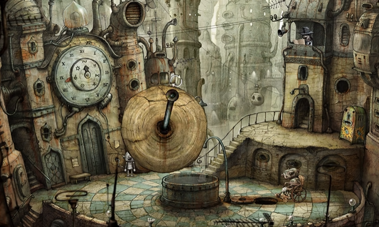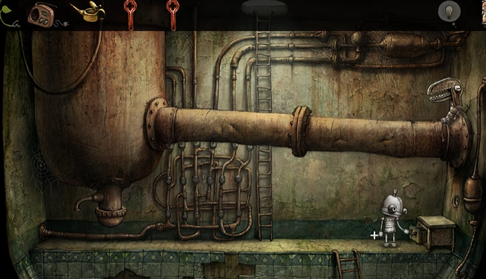 老头的下水道关卡需要玩家通过一系列道具组合与环境互动来解开谜题。玩家会被胖子和瘦子机器人抓住并关进牢房,牢房内有一个残疾机器人。墙边有一个水龙头,拧动两次后可将其取下。同时收集地上的草和卫生纸,将草放在牢房顶部的灯泡下烘烤至变黄,再与卫生纸组合制成香烟。将香烟交给残疾机器人后,他会与玩家握手,可将其手臂拧下。