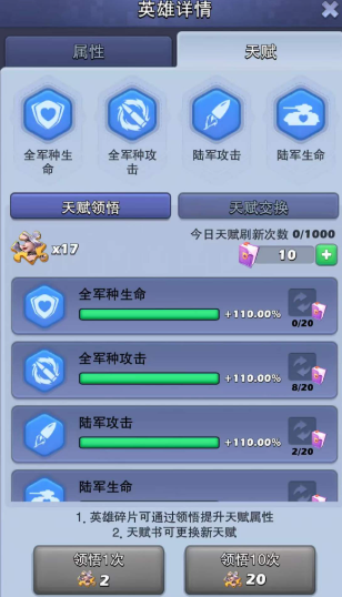 天赋对英雄提升特别大,主力英雄到120级后一定要重点搞天赋。建议把4个天赋槽全开,不是想要的就用天赋书刷新。战斗英雄最好刷出全兵种攻击、全兵种生命、本兵种攻击和生命这些属性。紫色英雄升天赋要用紫色万能碎片或英雄碎片,所以平时多攒点没坏处。天赋还能转移给其他同颜色英雄,每次转换花1000钻,算是后期调整阵容的小技巧。