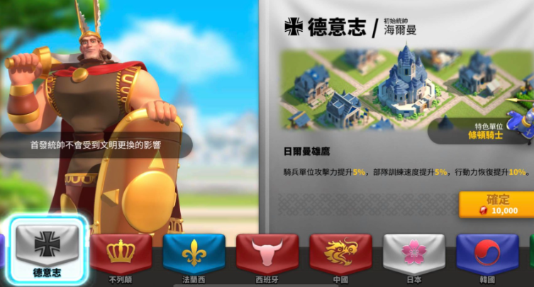 德意志文明是骑兵流派玩家的首选,其提供5%骑兵攻击力、5%部队训练速度和10%行动力恢复速度的全面加成。该文明特别适合已解锁T4兵种并计划向骑兵专精发展的玩家,搭配阿提拉、萨拉丁等骑兵统帅能显著提升野战和集结作战能力。德意志文明的建筑风格偏向城堡造型,适合追求战斗与美学统一的玩家。需骑兵体系对装备和天赋要求较高,前期资源不足时需谨慎选择。
