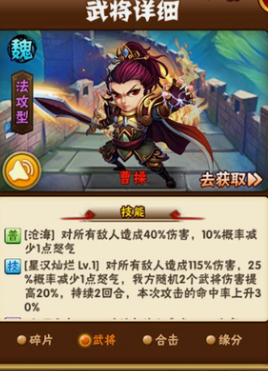 曹操作为魏国核心武将,在前期阵容中具备极强的控场和输出能力。其主动技能奋勇一击能造成大量伤害并概率降低目标攻击力,合击技能声东击西则对敌方全体造成伤害并削弱防御力,这些特性使其成为前期推图和竞技场的重要选择。曹操的天赋技能涵盖统帅、勇武和智谋三方面,玩家可根据需求选择强化方向,通常建议优先提升输出和控制效果。