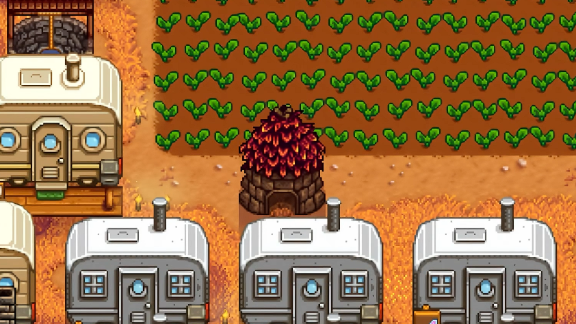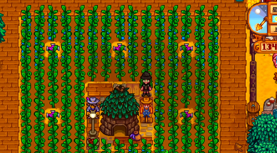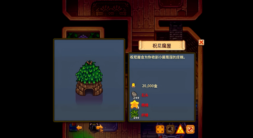 祝尼魔小屋是星露谷物语中一种能自动收获农作物的功能性建筑,放置后会有祝尼魔入住并负责采集成熟作物。其工作范围是以小屋门为中心,向四周各延伸8格形成的17×17正方形区域,覆盖约283块耕地。祝尼魔能收割包括花卉、茶叶、攀爬作物在内的绝大多数植物,甚至能穿过棚架采集难以手动获取的作物,但无法处理野生种子种植的植物、花盆作物或巨型作物。