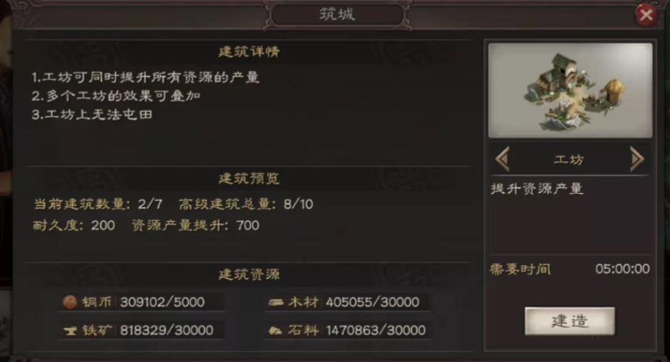 造币厂是最实用的高建,建议优先建造6-8个,它能稳定产出铜币,每小时基础产量200铜币,满级可达1000铜币。铜币在游戏全程都紧缺,无论是招募武将、驯马还是战法点都离不开它。建造需要6级地和6000名声,后续每增加2000名声可多建一个。工坊适合前期过渡,建在7级地上,能提升基础资源产量,但后期作用有限,建议只建1-2个。虎帐适合喜欢打架的玩家,建在8级地上可增加预备兵上限,但需要至少3个才能见效,否则性价比不高。