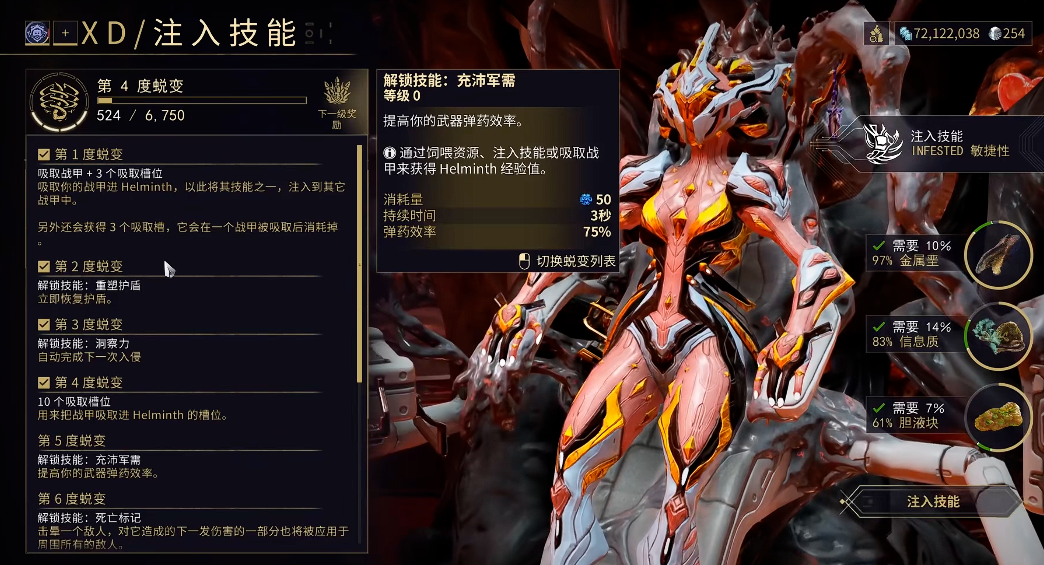喂战甲的操作其实很简单,在感染房界面选择吸收战甲选项,系统会自动识别当前穿戴的战甲。每天只能喂一次战甲,这个冷却时间没法用白金加速。随着大嘴等级提升,能吸收的战甲数量也会增加。喂完战甲后,大嘴就能学会这个战甲的特定技能,以后可以把这个技能注入到其他战甲上。