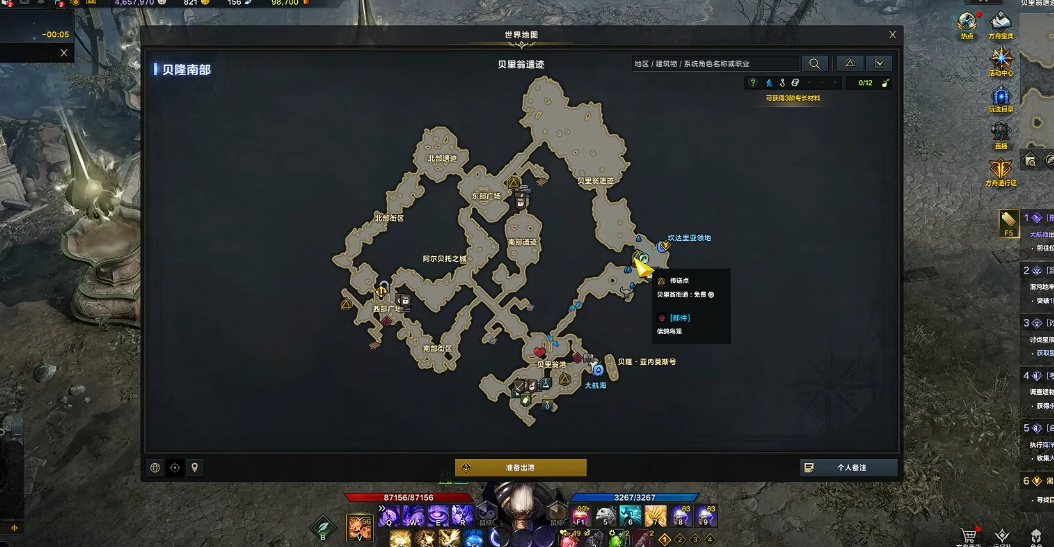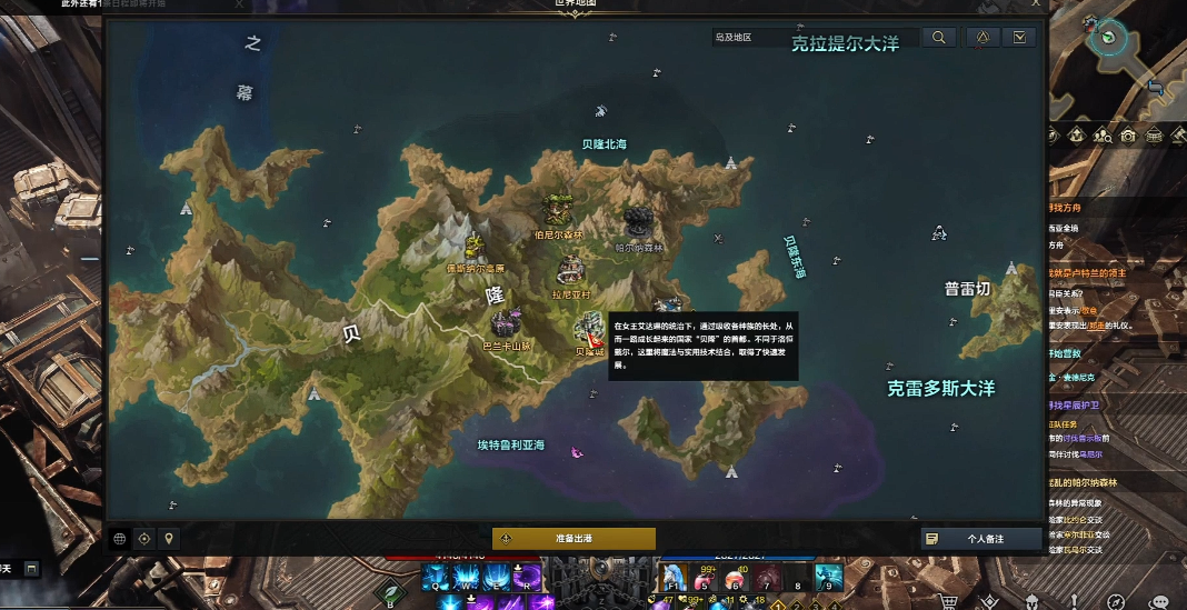 贝隆大陆分为南北两部分,北部以贝隆城为中心,南部则包含坎达里亚领地、贝里翁遗迹等区域。贝隆城作为北部核心,承担着装备强化、任务接取、副本入口等职能。城内魔法学会是觉醒任务的关键地点,玩家达到50级后需在此接取任务并与精灵女王对话。贝隆城港口提供船只强化服务,为后续跨海域探索做准备。