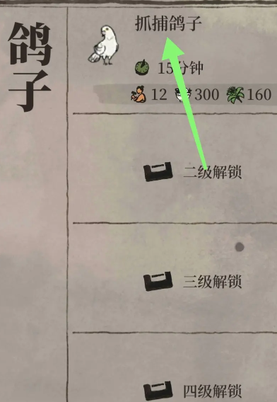 在投食槽建造完毕后,抓捕流程正式启动,玩家需要依次完成若干个准备步骤以布置陷阱。这些步骤通常包括翻找簸箕、收集树枝、获取麻绳以及制作诱饵等,每一步都会消耗不同的物资,例如菜肴、鱼肉、木炭、棉花和草药等。整个过程需要玩家按顺序投入资源,逐步接近最终目标,当所有前置条件满足后,游戏界面才会出现与鸽子互动的选项,此时点击鸽子即可进入抓捕阶段。