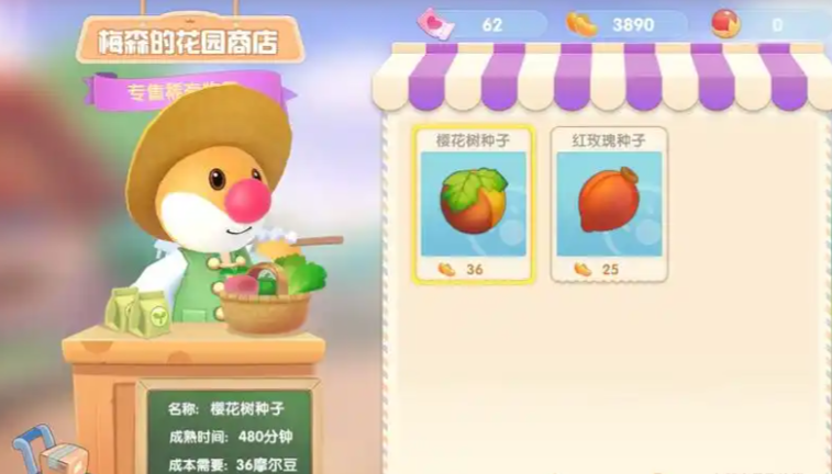梅森来家园做客时,你可以与他对话并打开他的花园商店。这时商店中会出现平常没有的红玫瑰种子,每粒种子售价25摩尔豆。你需要准备好足够的摩尔豆进行购买,购买后就能在自己的土地上种植红玫瑰了。红玫瑰从种植到成熟需要一定时间,成熟后即可收获使用。