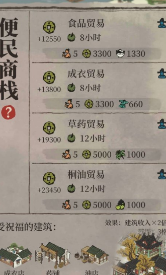 商栈升级分为多种类型,包括文化、便民、特产和建材商栈,每种类型都要求将指定种类的店铺建造多个并全部提升至四级。例如文化商栈需要画室、伞店和瓷器店各两个且均为最高等级,而便民商栈则依赖油店、药铺和成衣店的同样配置。玩家需先确保这些前置建筑就位且等级达标,才能触发商栈的形态转变。升级过程中,店铺的摆放位置也需谨慎规划,避免资源浪费或功能重叠。