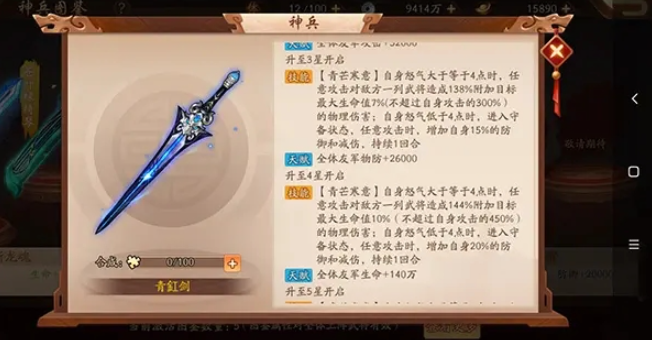 七星宝刀的核心技能名为七星断魂。其效果是,在佩戴者前两次攻击时,会对对位武将造成固定百分比的基础伤害,并附加自身生命最大值一定比例的无视防御物理伤害,同时为自身提供暴击率和伤害加成增益,持续2回合。该技能还有一个独特的效果,即当佩戴者自身死亡时,会再次对对位武将造成一次基于自身最大生命值比例的无视防御物理伤害,堪称死后一击。神兵星级的提升,这些伤害比例和增益效果都会显著增强,例如七星状态下,前两次攻击可附加最大生命值20%的伤害,死亡时则能造成40%最大生命值的伤害,输出能力非常可观。