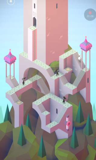 关卡伊始,艾达通常出现在一个带有亭子结构的场景中。首先需要做的是利用亭子作为遮挡,避开乌鸦人的视线,抓住其背向走开的时机迅速行动,移动到场景中的第一个按钮处将其触发。按下按钮后,初始墙壁上往往会出现可供旋转的楼梯把手,此时旋转该把手可以改变楼梯的朝向,从而为艾达创造通往上一层的路径,或者将挡路的乌鸦人转移到无法干扰行动的位置。当艾达成功抵达上层的另一个按钮时,尖塔上会出现爬梯,这是进入下一阶段的关键。