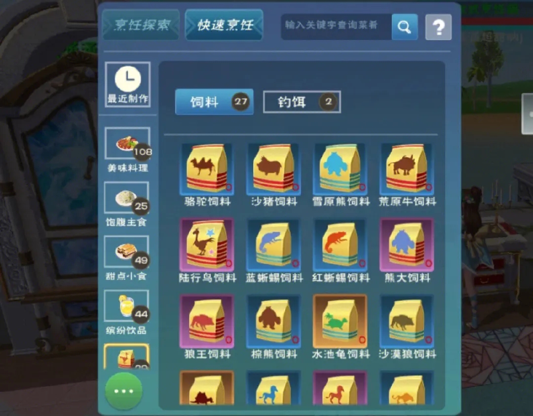 专属饲料是捕捉成功的关键,每种生物都有固定饲料配方,必须在烹饪锅中合成,普通生物与稀有生物的饲料材料、所需包数差异极大。比如红马需要胡萝卜饲料包加小麦饲料包,保底5-8包;蓝马需要蓝莲饲料包加小麦饲料包,保底8-10包;剑齿虎需要小龙虾、生牛排、饲喂肉块合成,保底10-12包;稀有坐骑如陆行鸟、飞龙则需要更稀有的材料,饲料包数要准备20包以上,多备饲料能防止眩晕期间喂不够导致驯服失败,每次喂食会刷新眩晕时长,直到生物头顶出现粉色爱心,代表可捕捉状态。