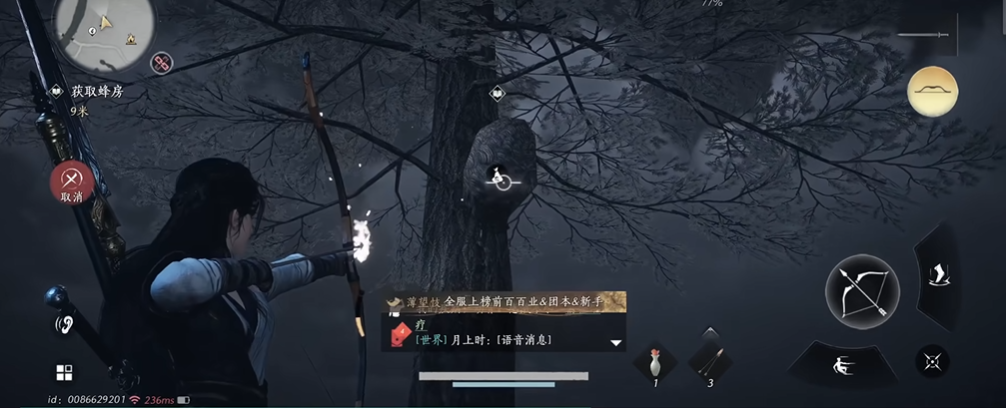 燕云十六声树上蜂窝可通过火箭点燃清除蜜蜂后拾取,或用弓箭射落快速拾取获取,核心分布在清河区域司南台、慈心山院、临江驿周边的高树与崖边,采集后可解锁眼力志趣属性。树上蜂窝又名细语蜂窝,外观为棕色球形,周围伴有飞舞的发光蜜蜂,靠近会触发蜂群攻击并附加中毒掉血效果,不能直接徒手摘取,需借助远程道具完成采集,是探索玩法中重要的蹊跷收集物。