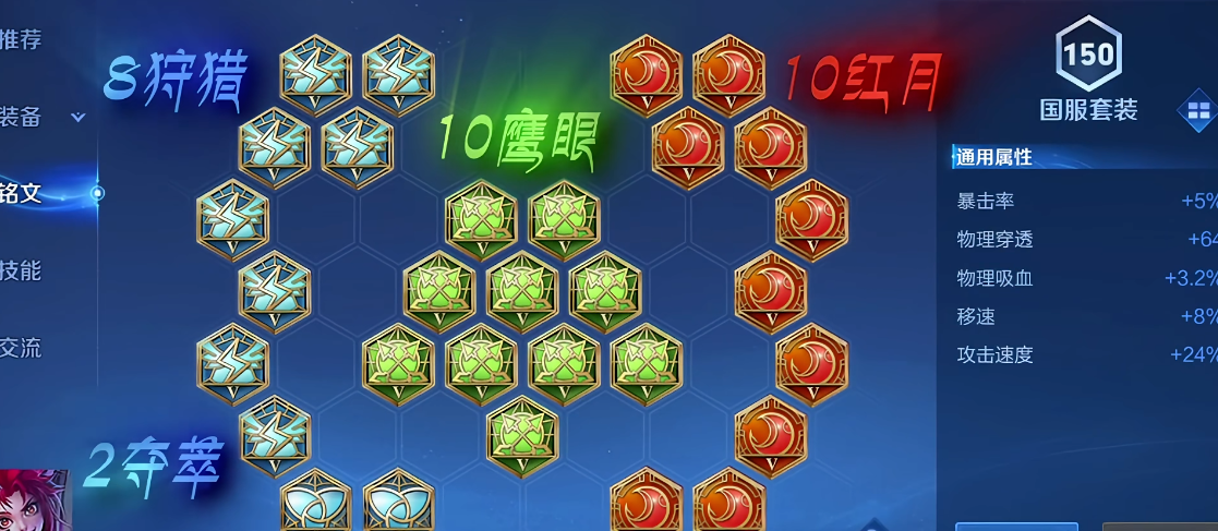 铭文方面,10无双提供高额暴击效果,是猴子打出爆发伤害的核心,确保每记强化普攻都能打出高额伤害;10鹰眼补足物理穿透,让前期刷野与攻击敌方英雄都能保证伤害不被护甲抵消;7夺萃带来物理吸血续航,减少回城次数,保障持续作战能力,3狩猎则提升移速与攻速,移速能让身法操作更灵活,追击或逃生更顺畅,攻速则能让普攻衔接更流畅,配合技能打出更快的连招节奏。这套铭文组合平衡了输出、续航与机动性,完美契合身法猴需要频繁拉扯、持续输出的玩法需求。