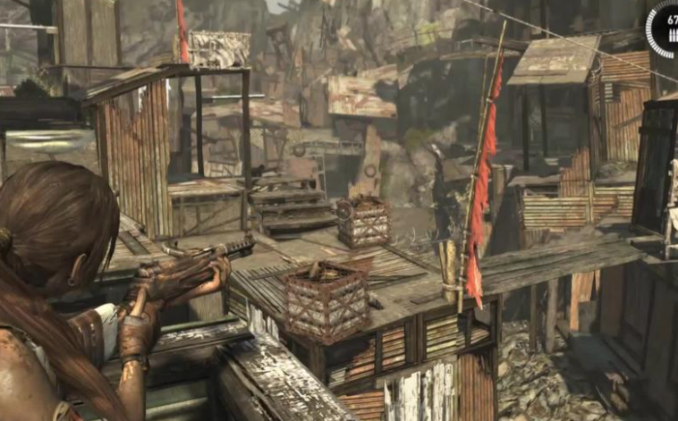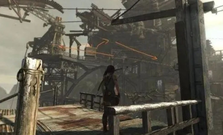 战斗结束后,切换至火箭箭矢瞄准大门上方的布条射击,燃烧完毕后靠近门右侧的曲柄互动。转动时可能触发剧情动画,显示格林被追捕的桥段。需快速沿街道左侧平台前进,避免被右侧水流冲入污水塘中断流程。